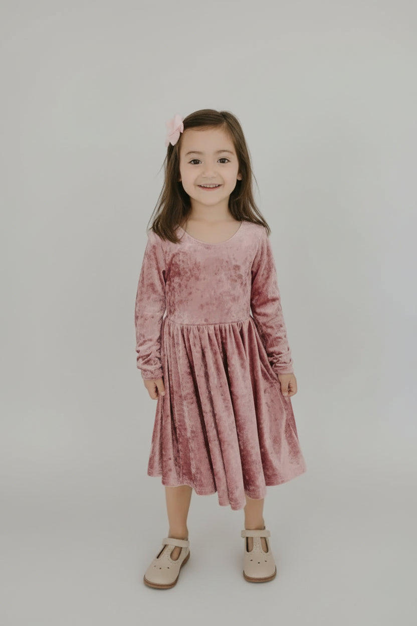 This charming dress is a twirl-worthy dream! With long sleeves, a sweet scoop back, and a full circle skirt made for spinning, it's perfect for playdates and picture days. Hidden pockets add a dash of practicality, while the ultra-soft crushed velvet keeps things cozy and comfy all day long. ✨💃💖